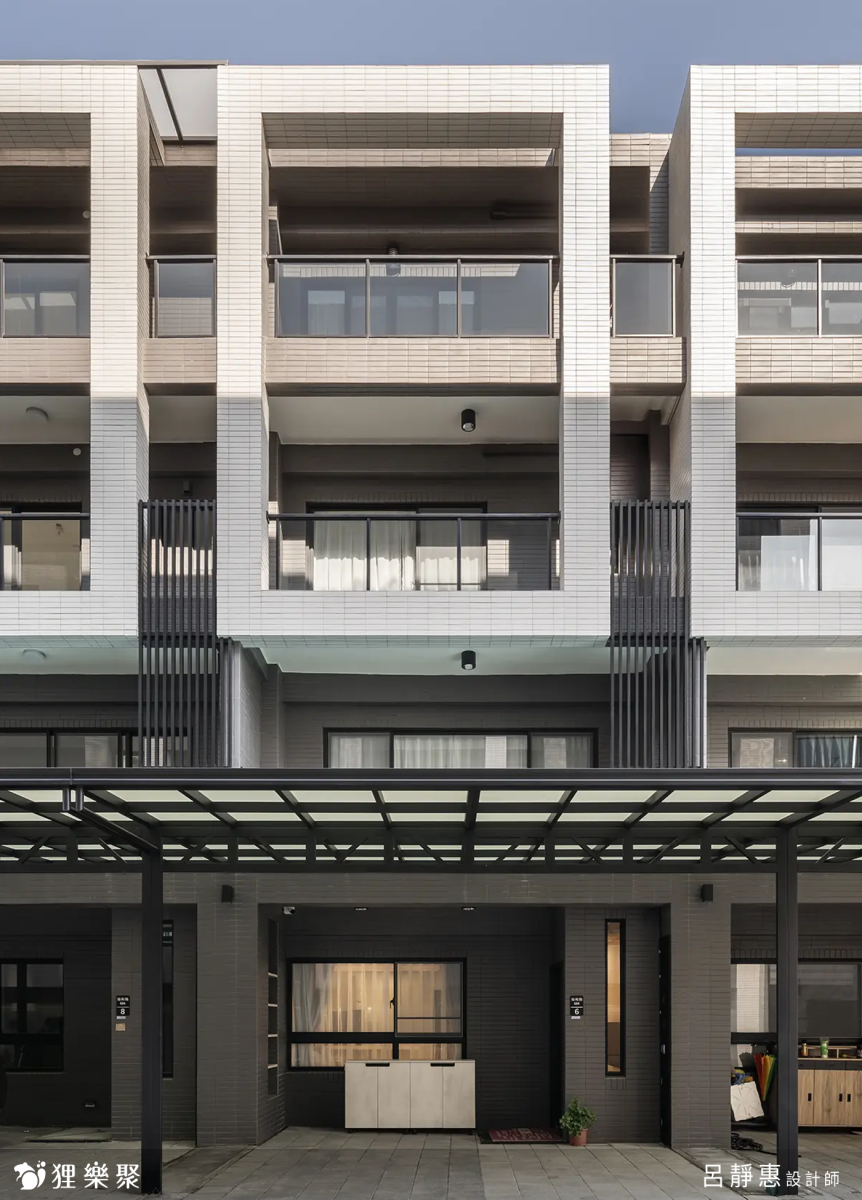 這是一棟45年的舊透天改造,原本的外觀是以前流行的馬賽克磚與頂樓加蓋,已經老舊且不符現代審美,屋主希望能做成明亮簡約的風格,因此外牆拉皮、頂樓鐵皮的外觀上,選擇用防水塗料處理,底色為白,加上黃、綠、灰來點綴,使外觀呈現明亮清爽的氛圍。