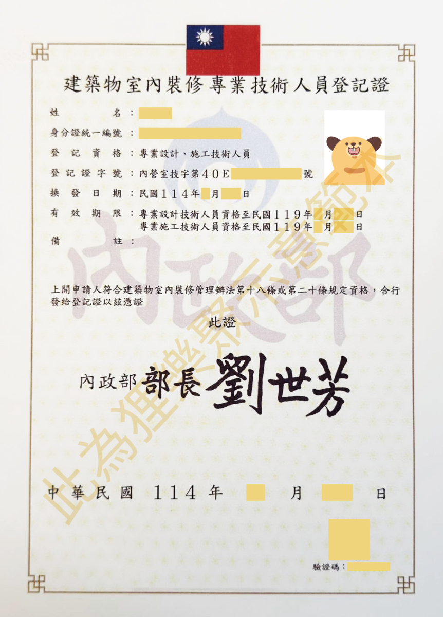 - 建築物室內裝修工程管理乙級技術士:可合法負責室內裝修工程施工與管理