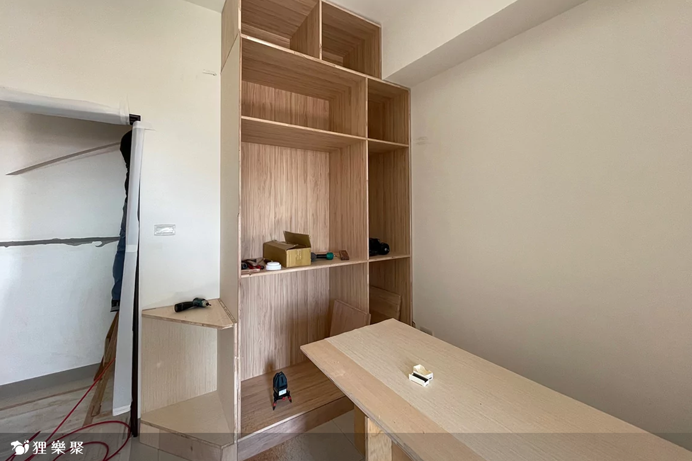 而木作櫃則是可以配合空間狀況訂製尺寸,也能做弧面、曲線等特殊造型,變化與靈活度都較系統櫃來得高,但工期較長需要1至2週,若有較為繁複、不規則的造型則需要更久時間。進料後會直接在裝潢現場施工,要特別注意裁切板材時會造成大量粉塵,若是選擇貼皮,黏貼的強力膠會產生異味,若直接於櫃體上面漆,也會有漆料的味道溢散。