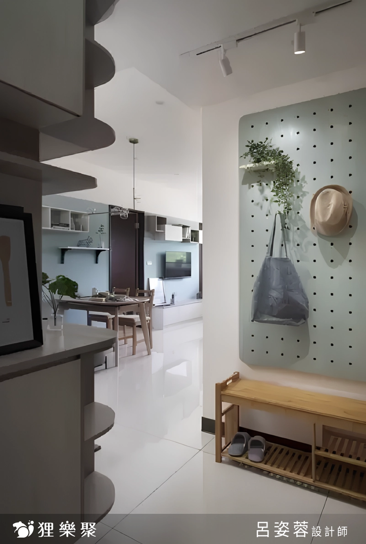 右側玄關櫃採用置頂的櫃體,局部懸空分別留有掃地機器人的家,也留有給客人擺放鞋子的空間,中間L形的開放設計有放包包的平台,搭配掛衣桿成為一個簡單的汙衣區,能暫放只穿一次還不打算洗的衣物,牆面的彩色圓形掛勾不但能掛東西,也成為一個趣味的端景。