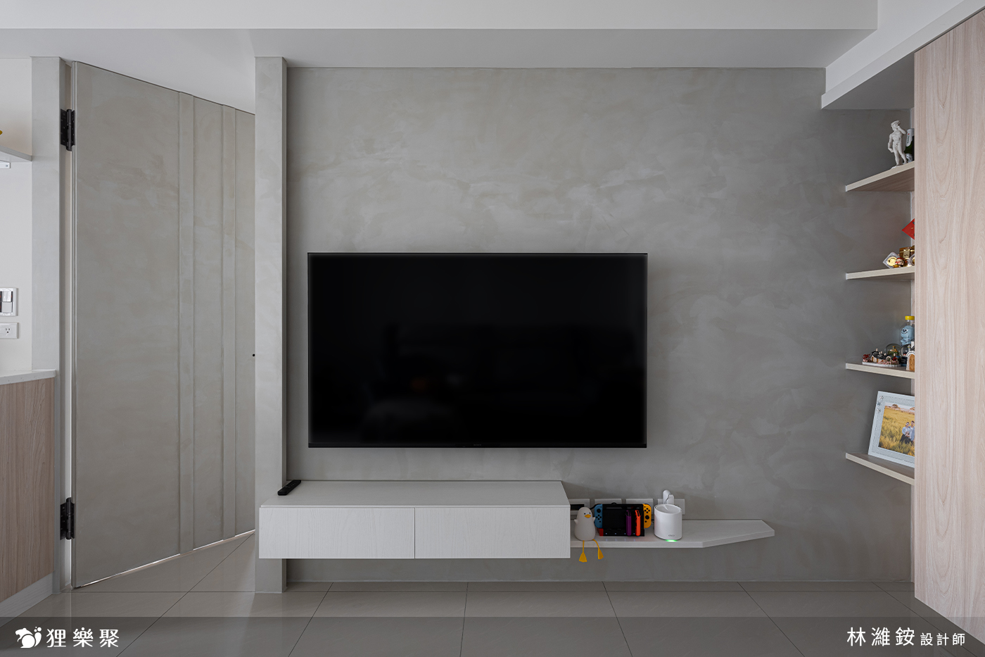 來到客廳,因為屋主一家並不常用餐桌,便選擇購買隱藏式的折疊餐桌置於牆邊,讓生活動線能順暢無礙。同側上方的櫃體以半開放式呈現,開放的部分能擺放一些賞心悅目、能展示的用品,門櫃則能收納較雜亂的日用品。另一邊為了避免視覺效果壓迫,電視櫃並沒有選擇全部做滿,而是正對沙發的木色矮櫃擺放電視,一旁選用白色門片做置頂櫃,使居家收納的容量充足,空間也維持了通透感。