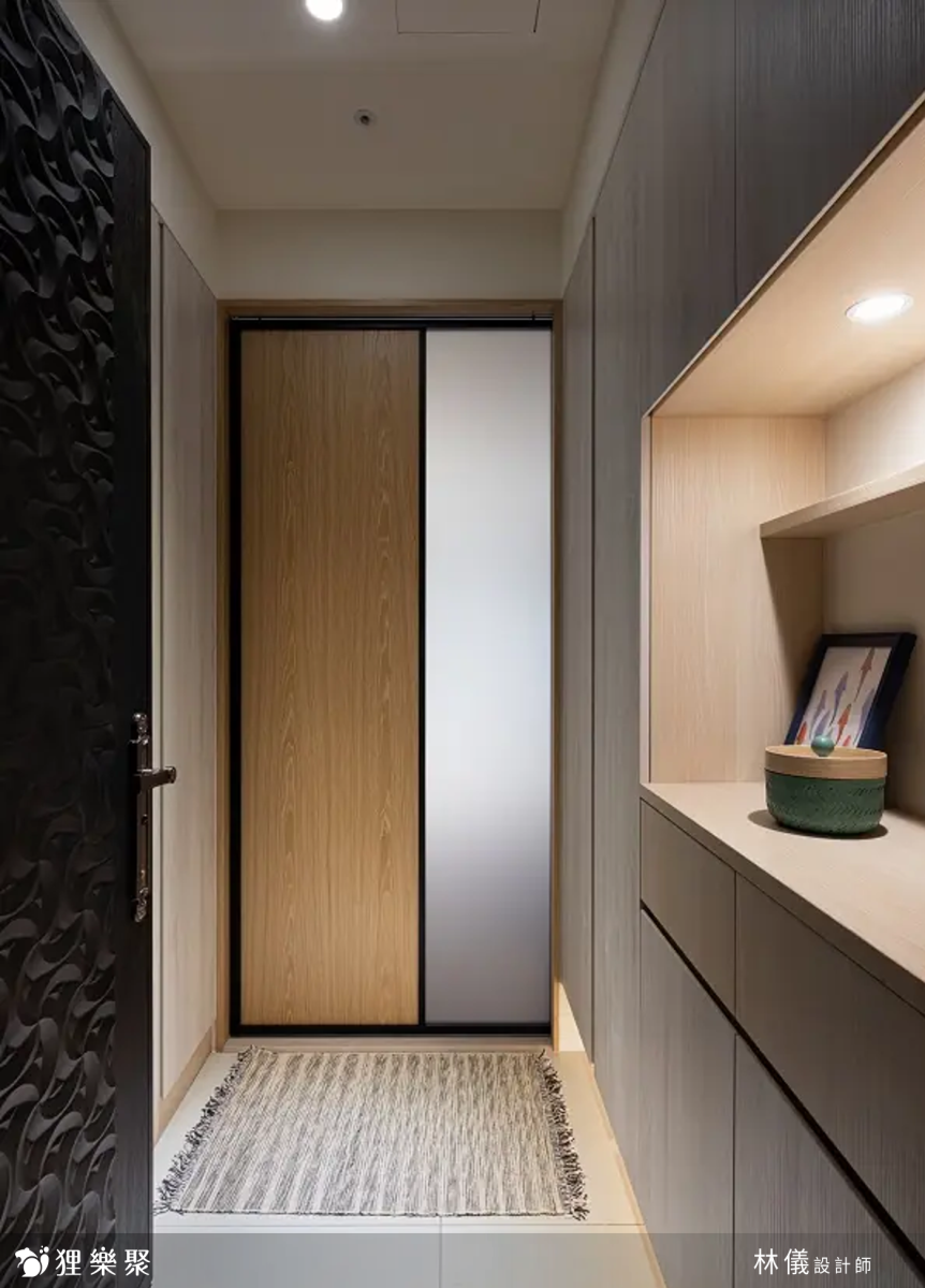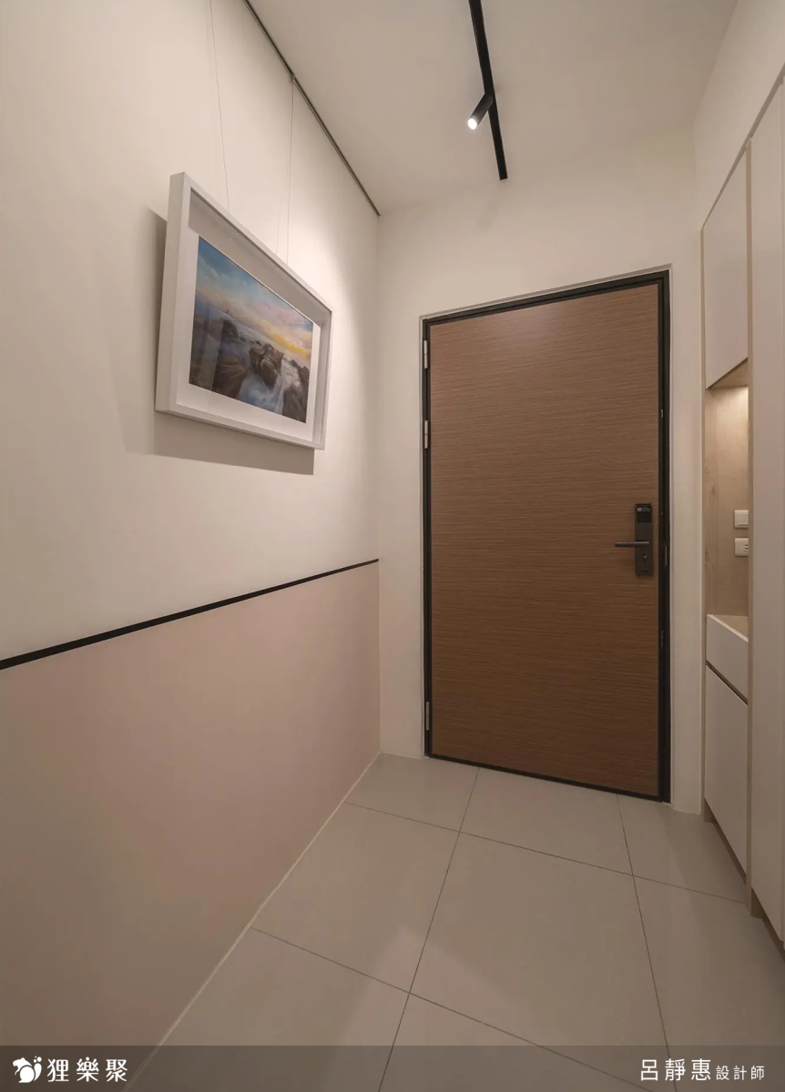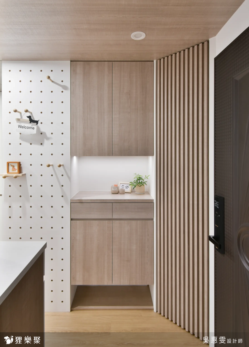 這個案子的特殊之處,是只透過系統櫃、油漆、木地板,再搭配不同的主燈展現出風格。接下來狸樂聚帶大家看看這篇的重點──玄關裝潢。