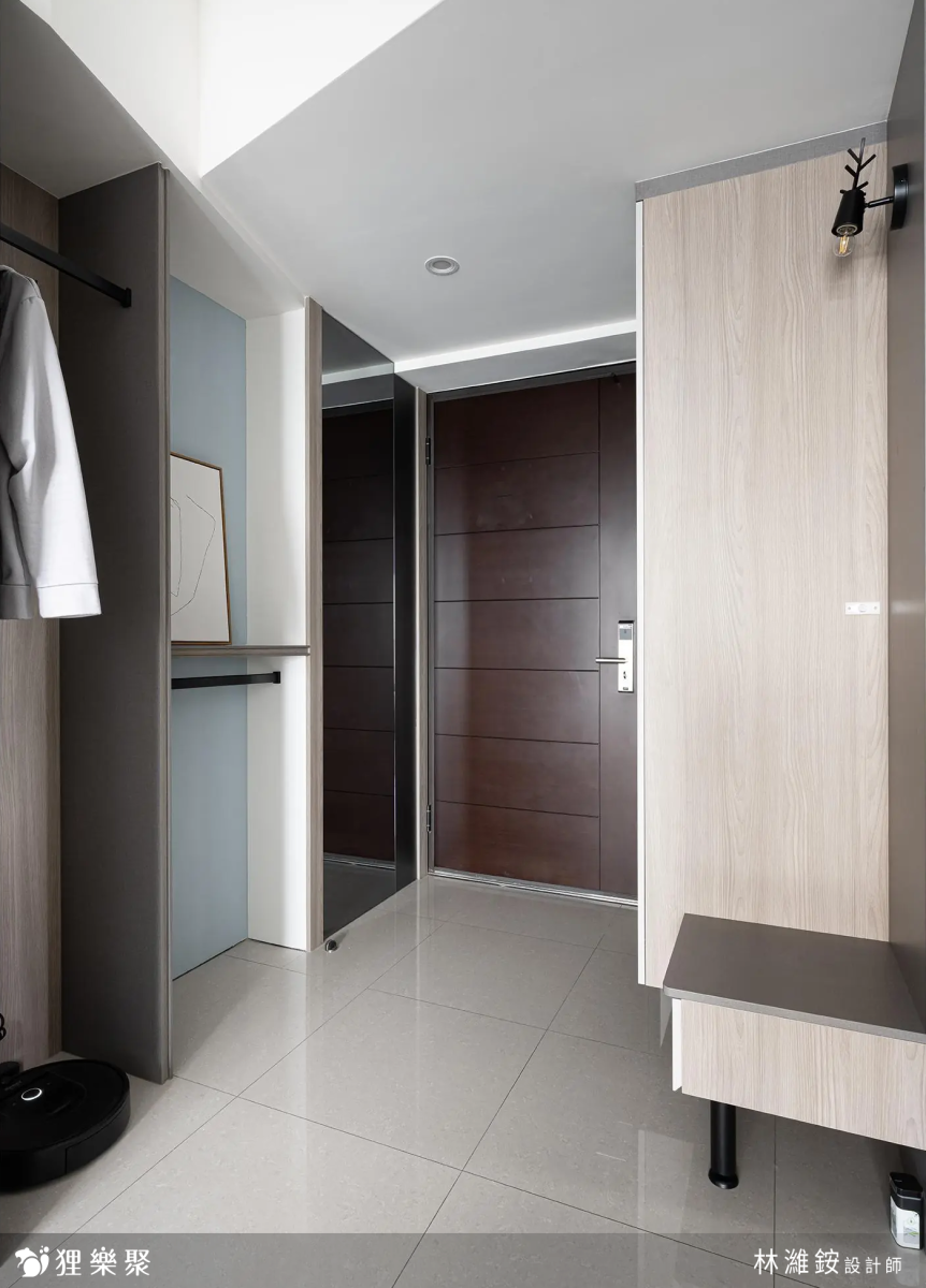 門後的畸零空間做了懸吊式的頂天玄關櫃,富有外出包放置區、汙衣架、工具間的功能。而白色的門片搭上牆體的藍色調,與深木色、地板的淺木色,還有大門的黑色營造出了層次感,沒有多餘裝飾,單用玄關設計展現出屋主對於質感的要求。