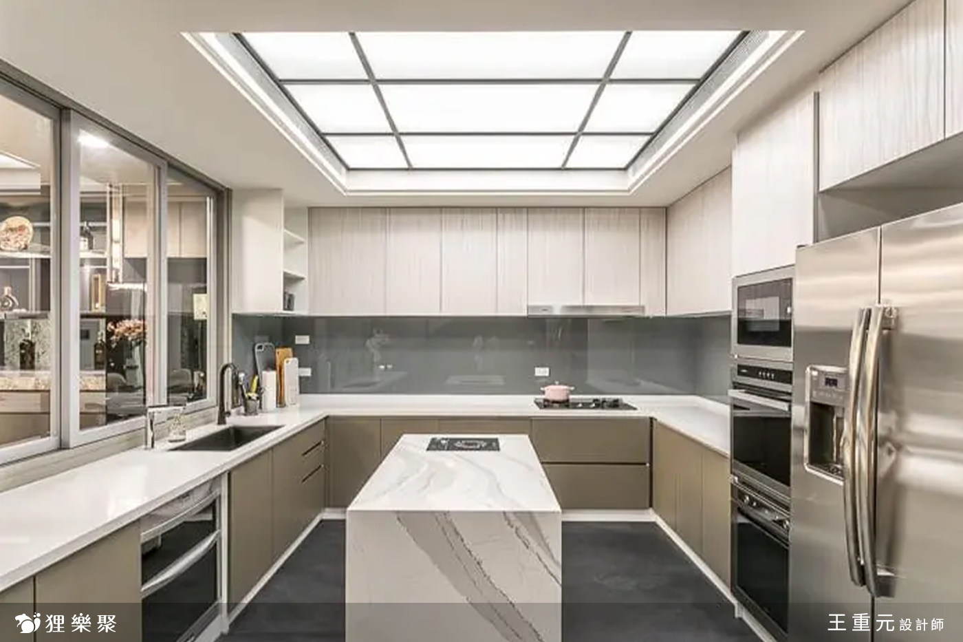也因為占地寬廣,使用者有充足的活動空間,因此做廚房設計時,洗滌區要擺在中央垂直位置,而備餐區及烹飪區平行相對,如此一來工作動線才會順暢。此外,備餐區同時也能有餐桌、吧檯功能,用途多元。