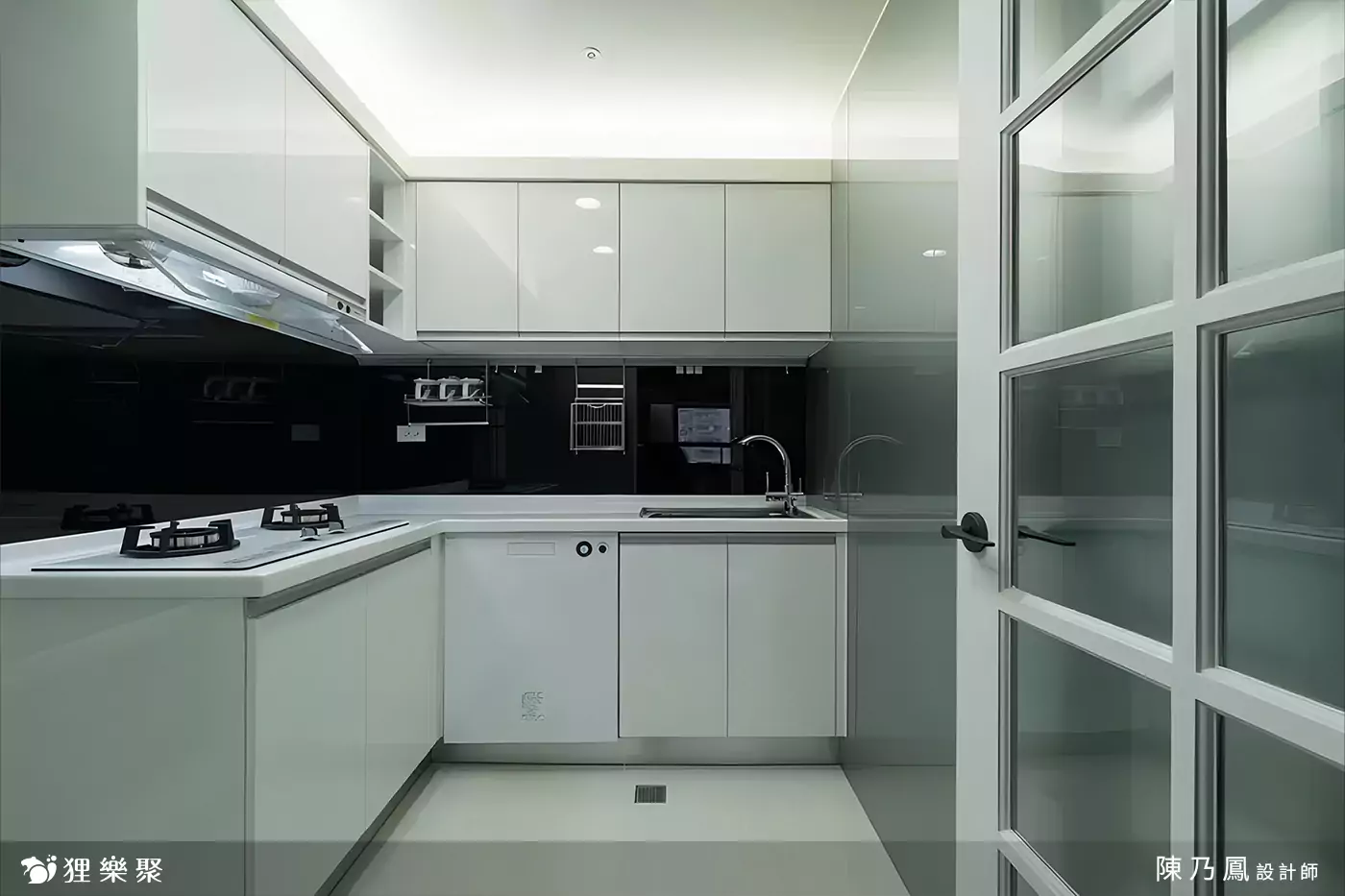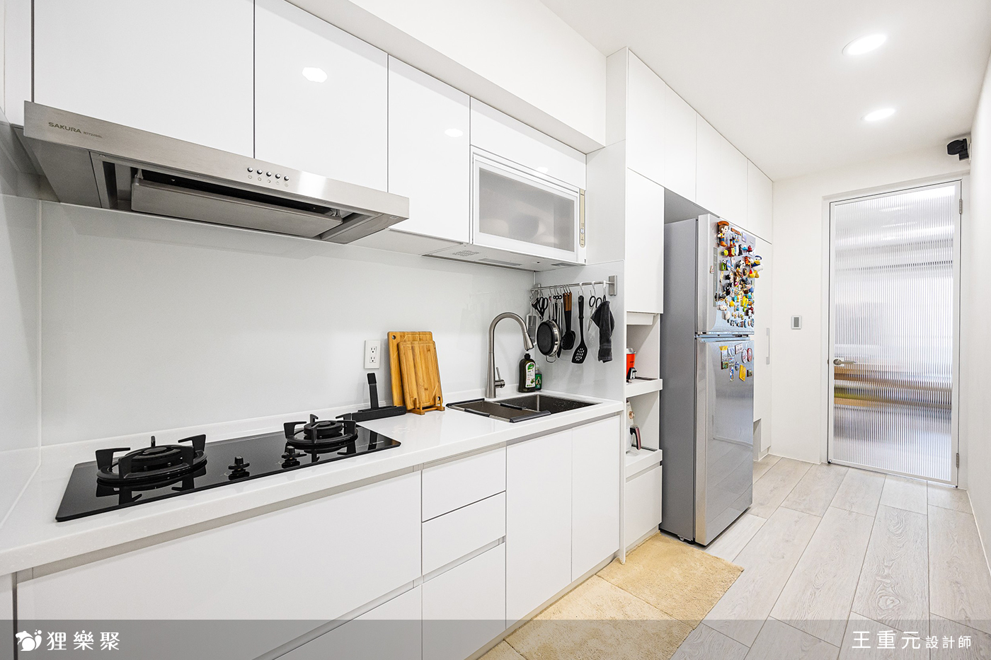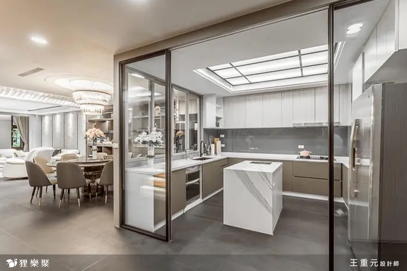 屋主喜歡與三五好友在家中燒烤聚餐,需要獨立的廚房設計,因此設計師將廚房與餐廳設計合併,用玻璃門減低小空間的壓迫感。洗碗機、冰箱也採用嵌入式,使整個空間風格一體成形。