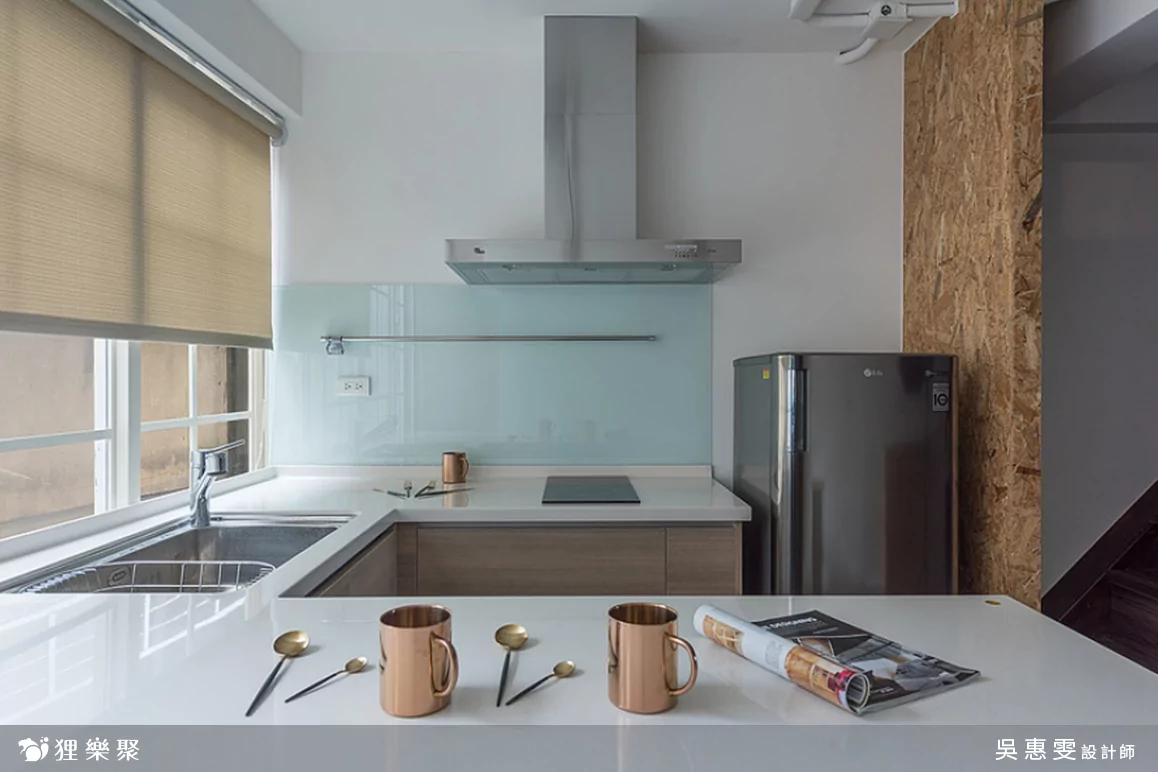 由於坪數小,廚房與餐廳設計皆採用開放式,與客廳連成一氣,廚房設計並未做太大的裝修變動,使用基本的一字形廚房,僅追加一小塊長虹玻璃,避免傳統風水開門見灶的疑慮。