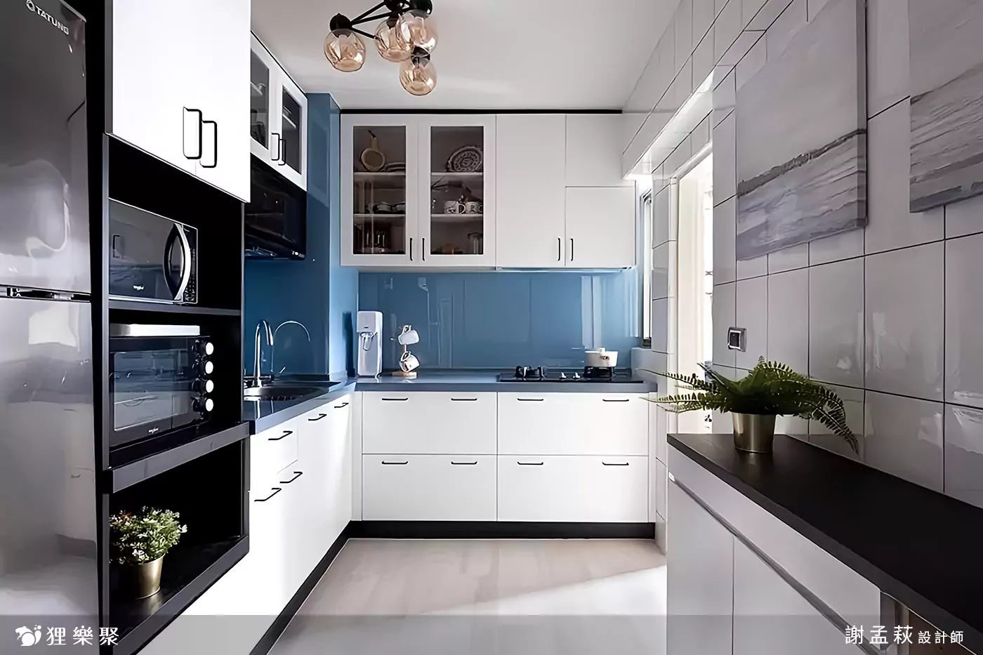L字型廚房是廚房設計中空間運用最淋漓盡致的一種,在裝潢規劃時要注意轉角兩側的工作檯面不宜過長,否則將減少高效的優勢。