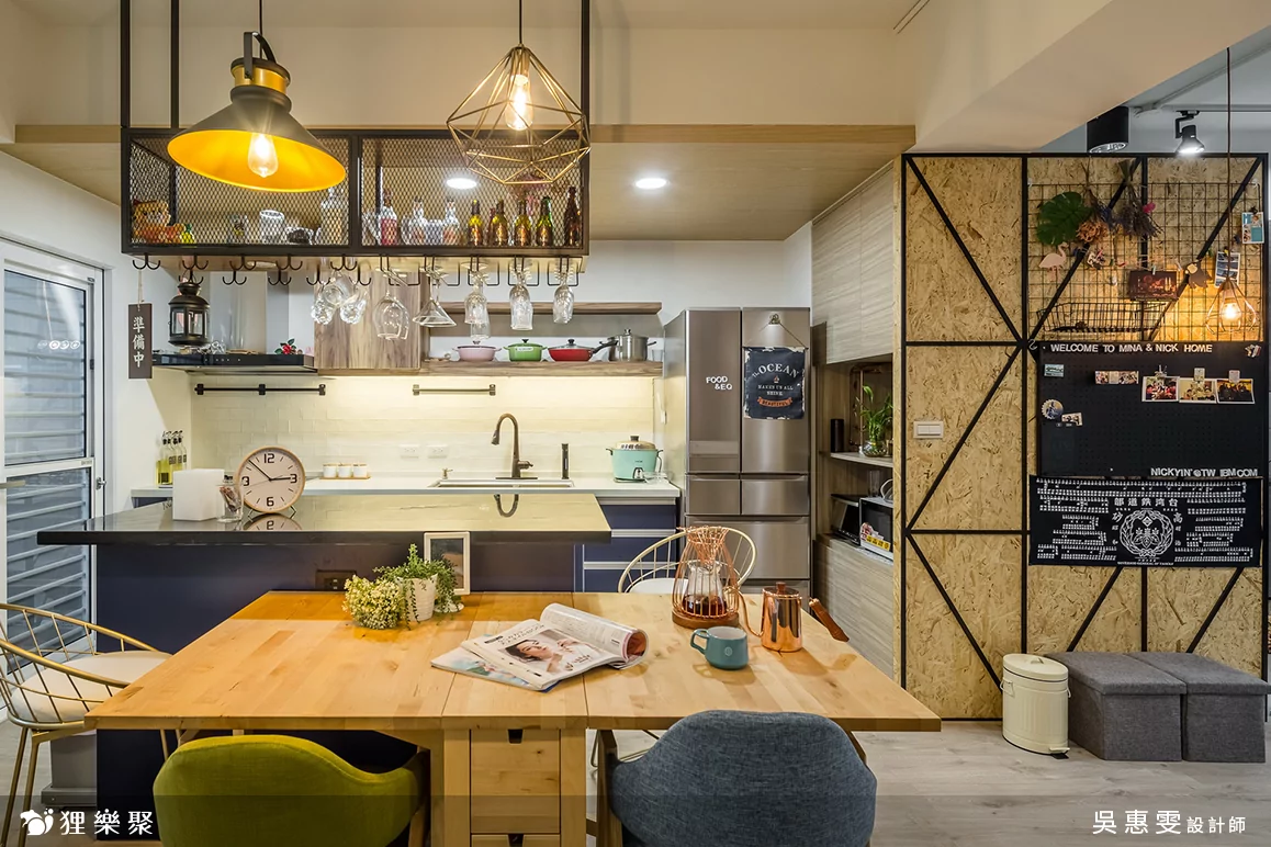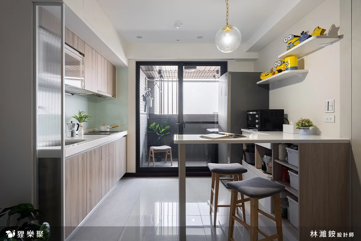 此外,設計師利用吧檯桌取代傳統餐桌,並區分出客廳、餐廳領域。而吧檯桌設有電器櫃與收納櫃的功能來擺放小家電、生活雜物,讓小空間不壓迫,也不會遮掩落地窗的自然採光,搭配一盞造型吊燈,使屋主一家於夜晚用餐時,也能有輕鬆愜意的氛圍。
