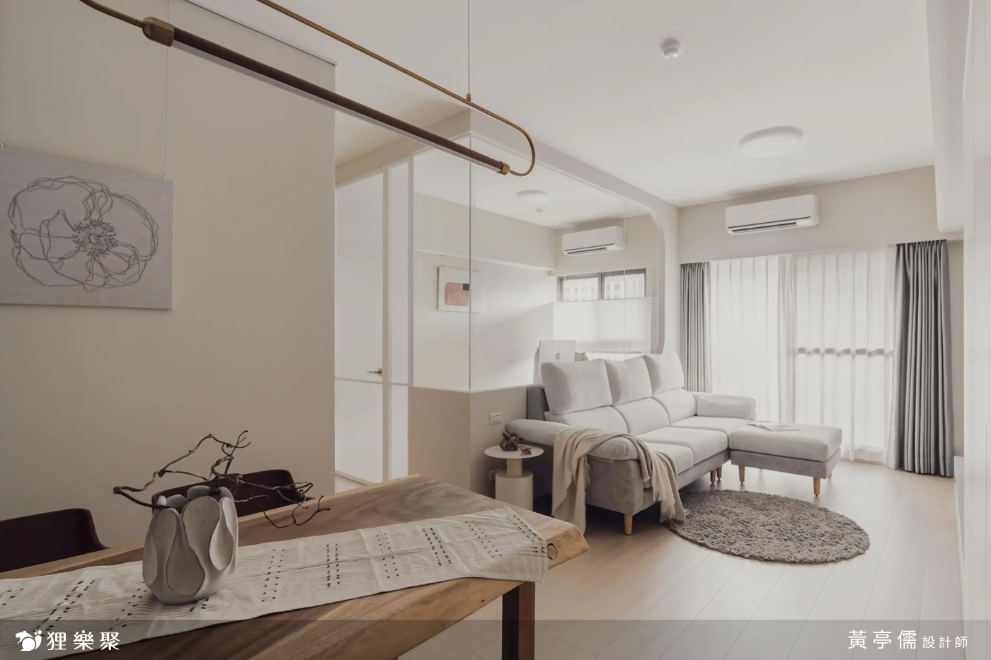 雖有30坪,但因為隔間多,客廳空間不算大,電視採用壁掛,挑選小圓几搭配L型沙發和椅凳,營造出一個回字動線,並保留足夠寬敞的通道能夠走動。而背後的書房裝潢成半牆加玻璃隔間,書房的吊架與展櫃成為渾然天成的視覺焦點,空間也更加通透。