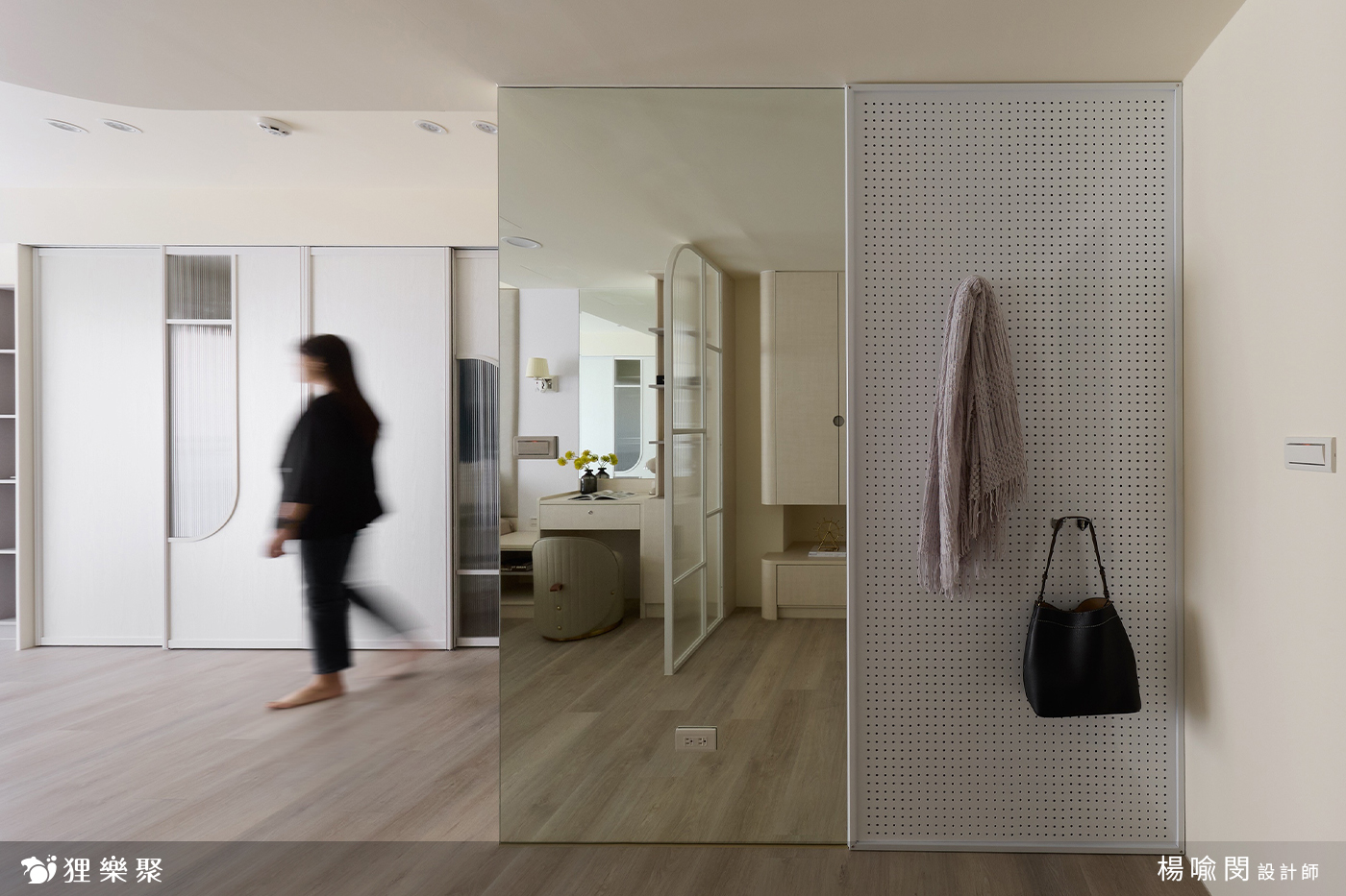 為滿足彈性收納需求,更衣區的一側牆面設計了彈性的洞洞板,讓包包、帽子等配件能隨心吊掛,成為一幅個人風格的展示牆。一旁的鏡面牆,不僅方便整理儀容,也巧妙地放大了空間感,讓更衣的過程更加方便自在。