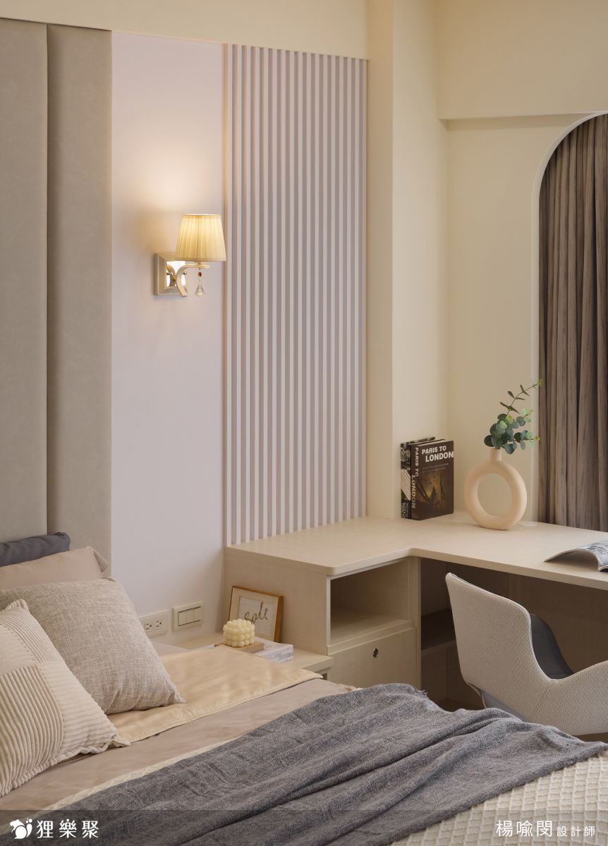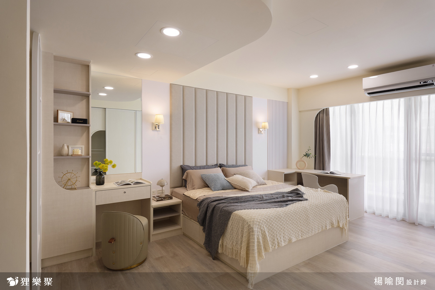 主臥室延續了公領域的圓弧設計,床頭主牆以麂皮繃布搭配線板,呈現細膩的觸感與層次,展現放鬆溫暖的氛圍。襯上一旁的高收納大容量衣櫃,搭配局部的長虹玻璃與圓弧語彙,增添視覺的輕盈與質感。房內整合了展示櫃、化妝檯以及L型書桌,創造出機能完整的休憩空間。