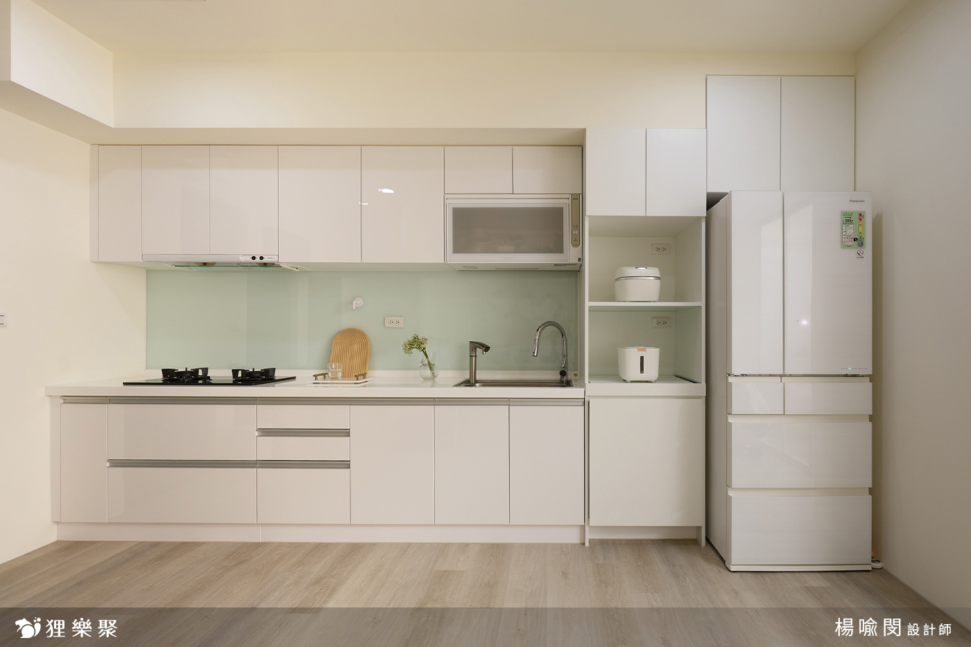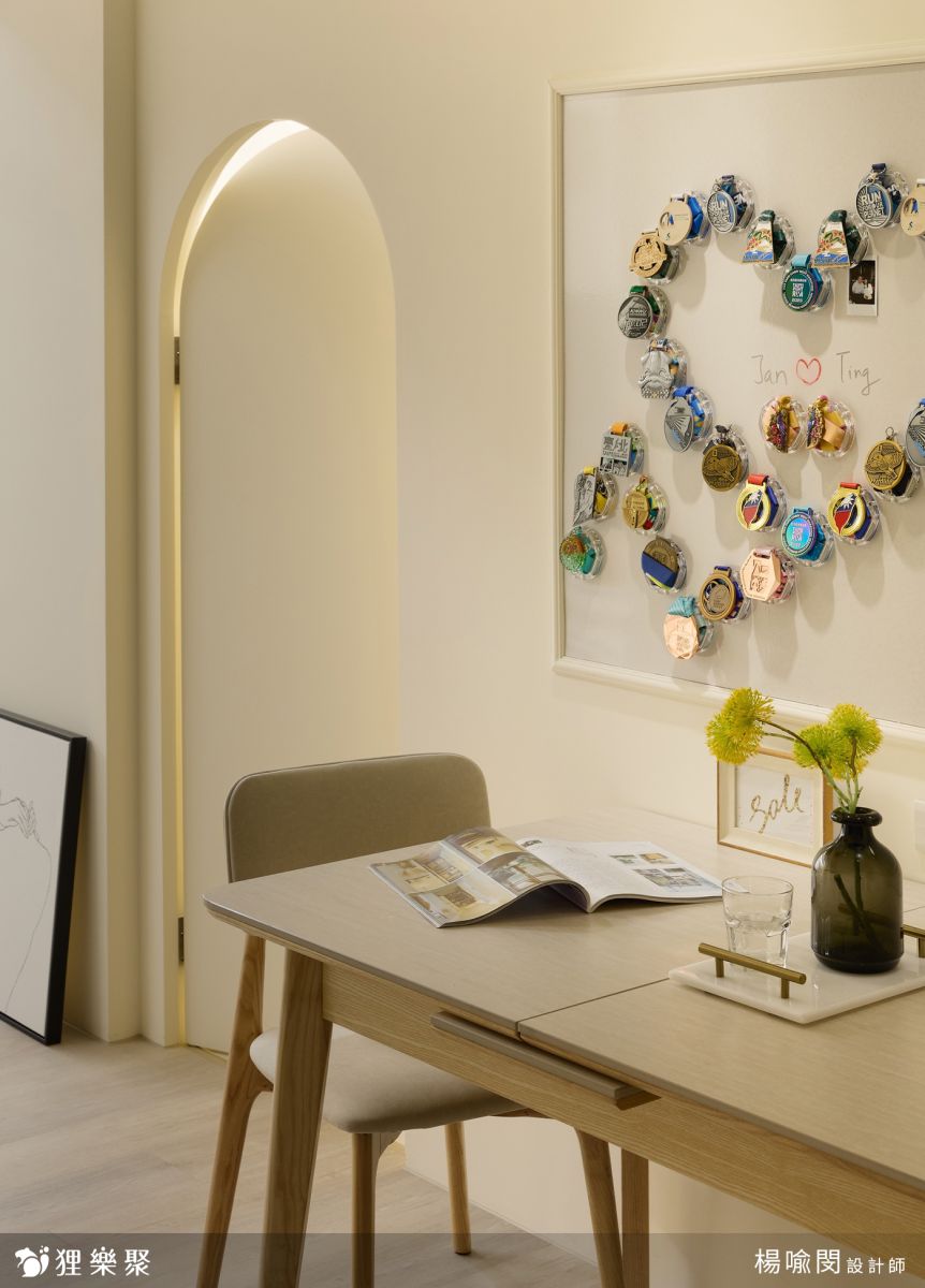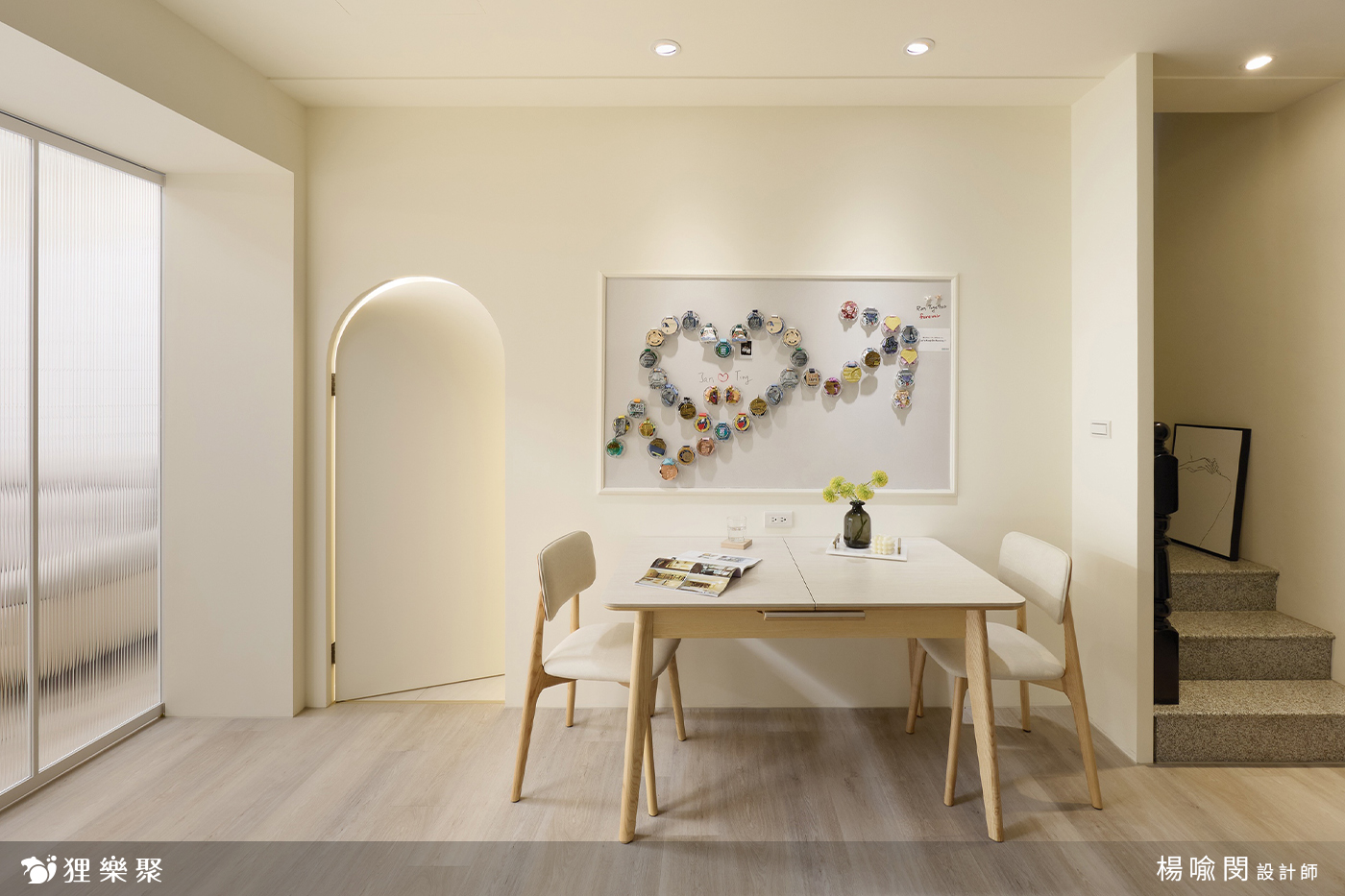 餐廳牆面規劃了一片磁吸琺瑯壁板,不僅是屋主夫妻倆的留言板,也是展示慢跑獎牌的榮譽牆,搭配可伸縮的餐桌椅組,使用上更加彈性。通往臥房的拱型門片與客廳圓弧設計相呼應。廚房規劃了隱藏式洗碗機與電器櫃,不僅高收納,也使烹飪動線更為流暢,視覺也更顯乾淨俐落。