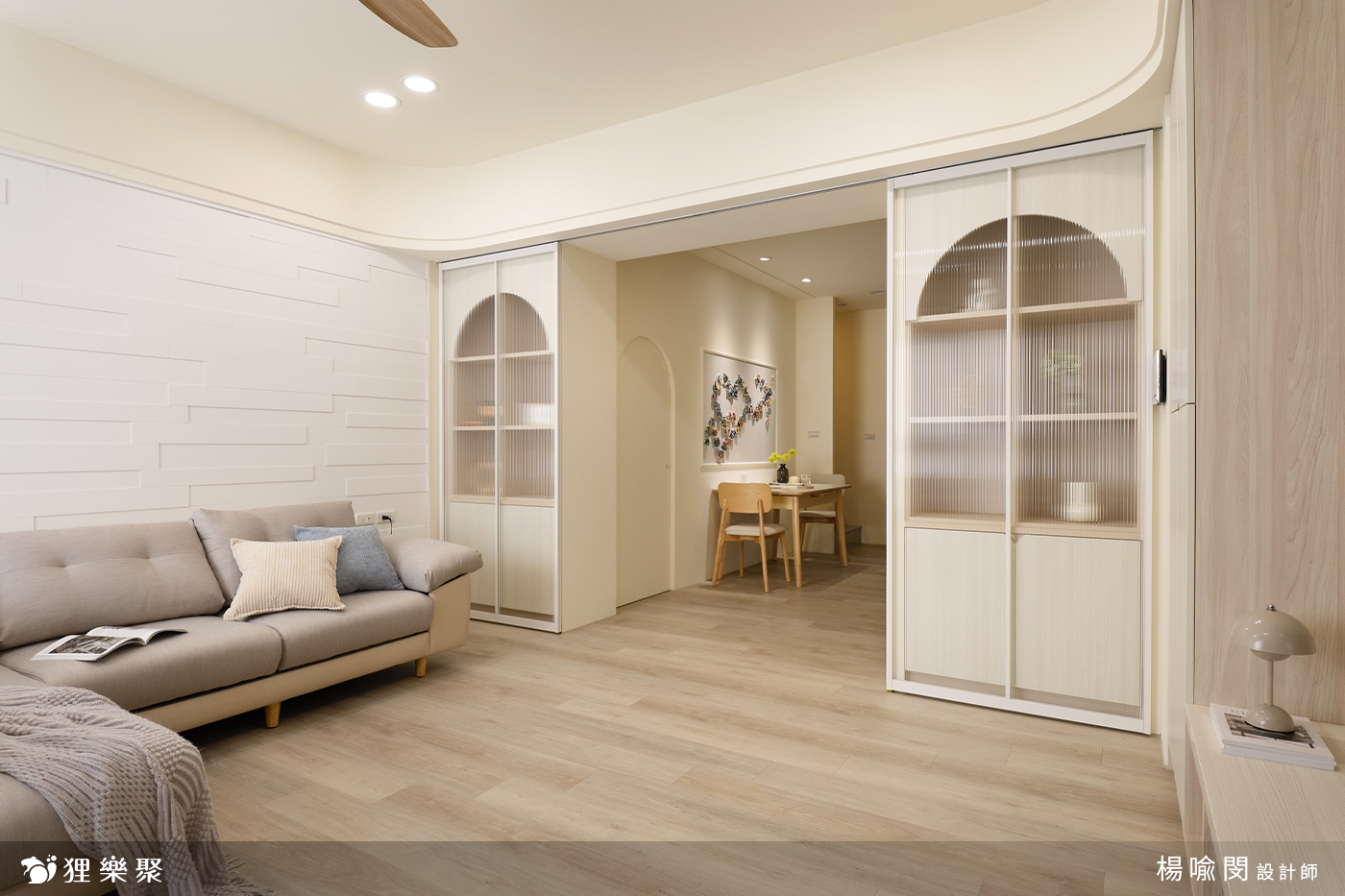 甫一進門,客廳圓弧設計的天花板、拱型展示櫃柔化了空間的稜角,搭配奶油色油漆、沙發背牆的造型壁紙,奠定了溫馨雅緻的北歐奶油風基調。