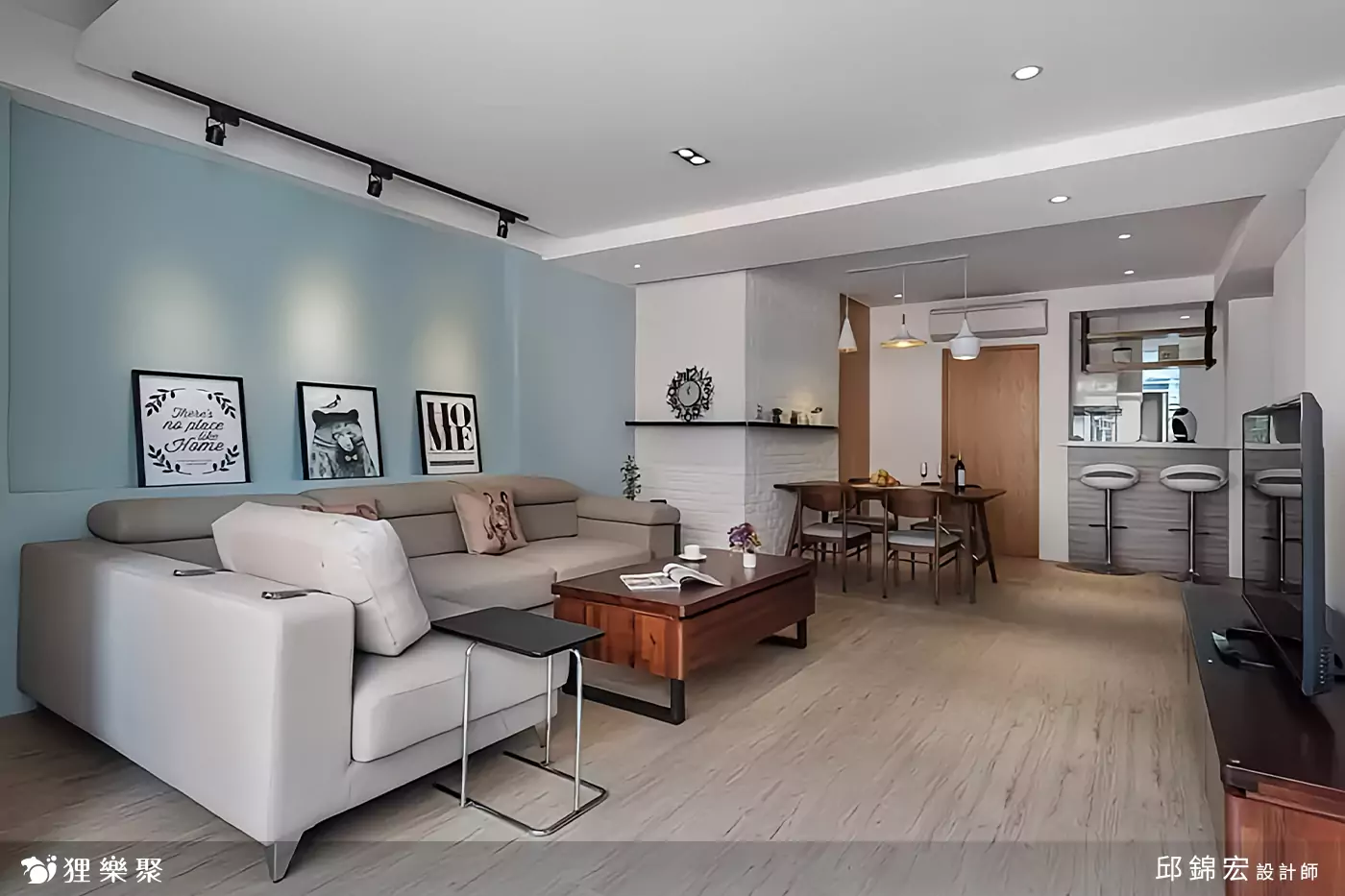 私領域用牆面的跳色創造出不同氛圍,公領域採用Loft風設計無隔間的規劃,串連了客、餐廳,廚房利用吧檯的設計給予一窗端景,便於上菜傳遞,也阻隔了油煙。回到家,腳踩溫潤的木地板,悠閒地坐在沙發上,放慢腳步與家人們享受著溫馨時光。
