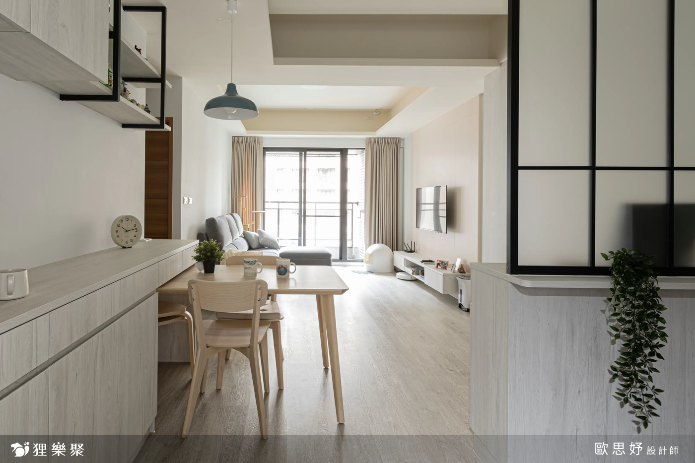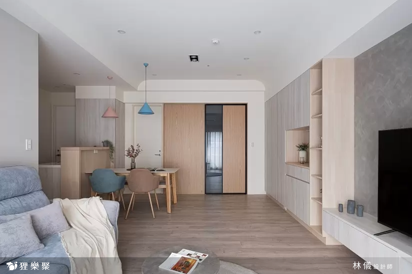 這個案子是一間14坪兩房兩廳的小宅,屋主希望有簡約乾淨的氛圍,因此設計師選用北歐風設計,天花與牆面以灰白色系為主,搭配嵌燈及落地窗,還有淺色系的木地板,創造出充足的採光以及北歐風的基底。